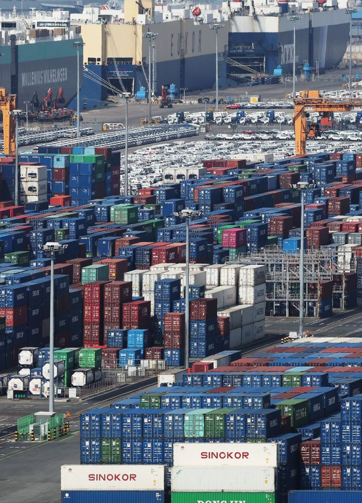 Containers are piled up at Pyeongtaek Port in Gyeonggi Province. Photo by Yonhap News