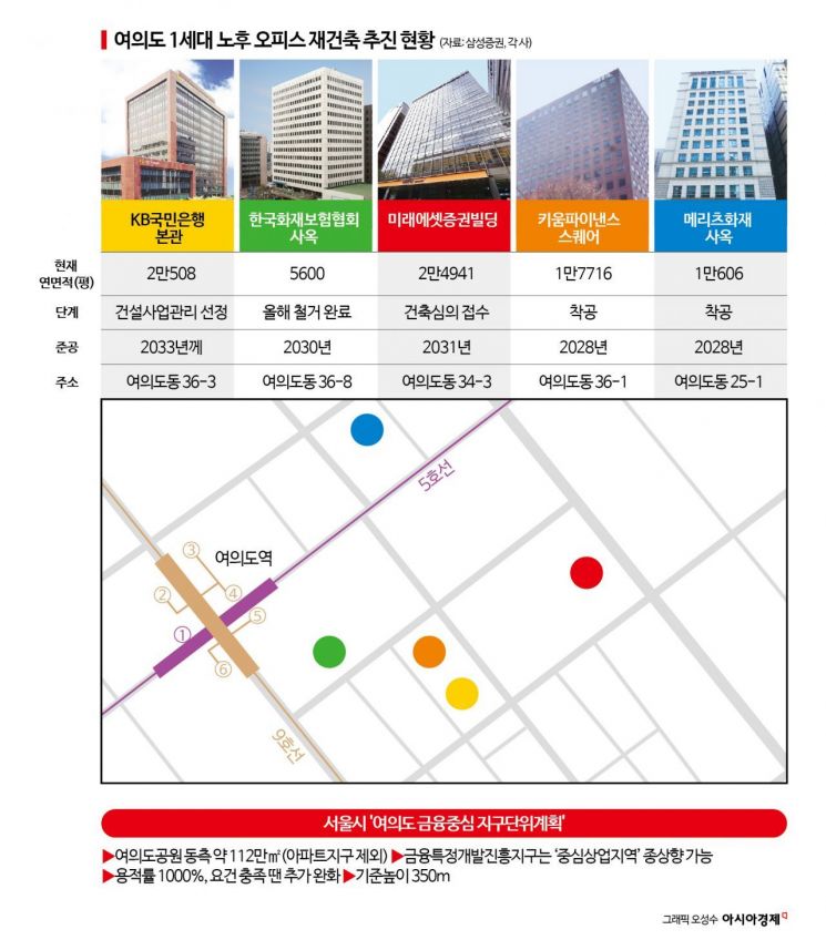 As a wave of redevelopment sweeps through aging office buildings in Seoul’s Yeouido financial district, the Yeouido skyline is expected to change significantly. Five sites—including the KB Kookmin Bank Yeouido Main Building, Korea Fire Insurance Association Building, Kiwoom Finance Square, Meritz Fire & Marine Insurance Yeouido Building, and Mirae Asset Securities Building—have seen their reconstruction projects become tangible. These buildings, constructed in the 1970s and 1980s, are regarded as first-generation office buildings that were built as Yeouido established itself as a financial district.