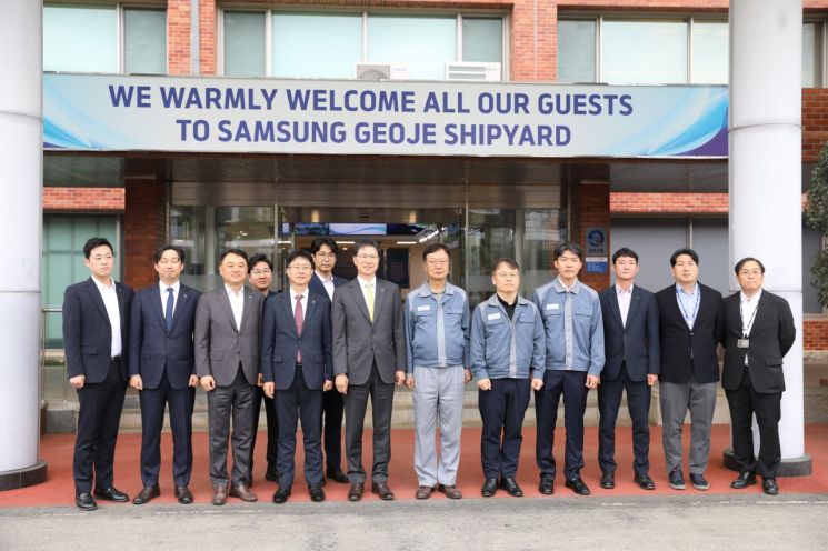Taeyoung Kang, President of NH Nonghyup Bank (seventh from the left in the photo), Seongan Choi, Vice Chairman and CEO of Samsung Heavy Industries (eighth from the left), and employees are taking a commemorative photo on the 14th at Samsung Heavy Industries Geoje Shipyard in Geoje, Gyeongnam.