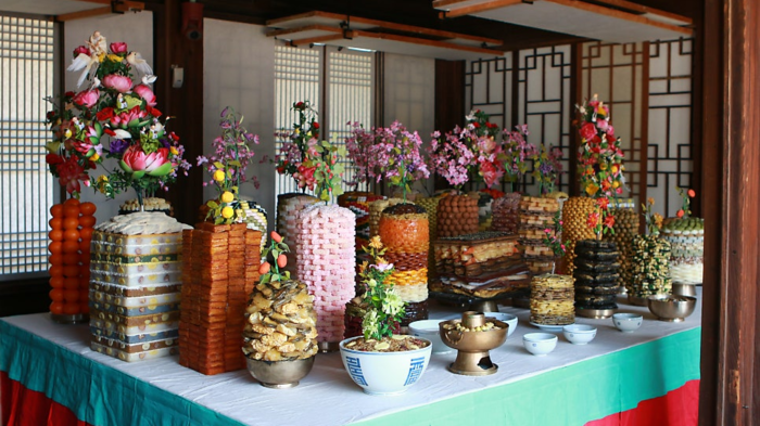 The culture of 'colorful decorative confections made from sugar or syrup' is not unique to the Korean Peninsula. In Japan, there is Rakugan, a sugar art confection that is placed on ritual tables.