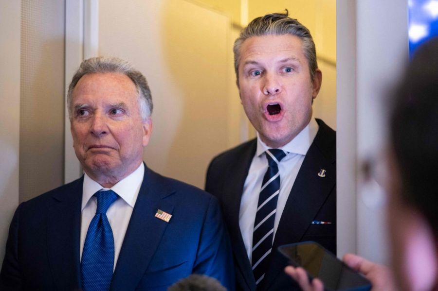 Pete Hegseth, US Secretary of Defense (left), is seen smiling with US President Donald Trump at the Shield of America Summit held in Miami, USA, on the 7th (local time). AP Yonhap News