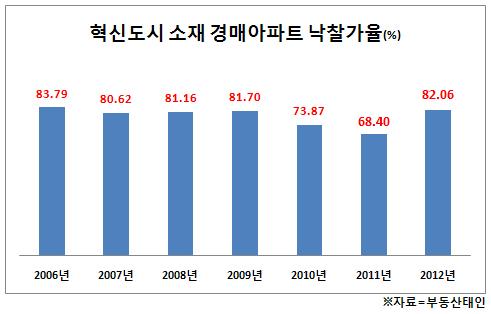 혁신도시 이전 1단계 계획 종료시점(2014년)이 다가오면서 공공기관 이전이 본격 추진됨에 따라 해당 지역 내 아파트 수요가 상승하면서 낙찰가율도 오름세를 보인 것으로 분석된다. 신건낙찰률이 16.84%에 달하는 등 매수 심리가 강해진 것으로 분석됐다.