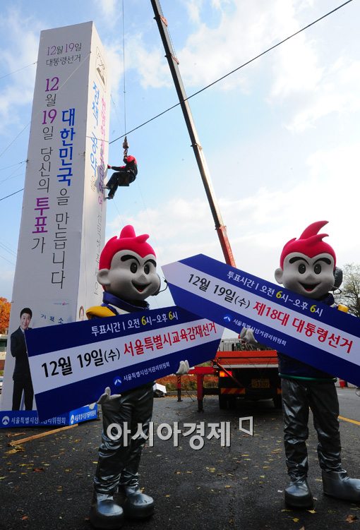 [아시아경제 백소아 인턴 기자] 12일 서울 성북구 북악터널입구 앞에서 서울시선관위 관계자들이 다음달 19일 실시되는 대통령선거와 서울시 교육감 재선거를 홍보하기 위해 대형 홍보탑을 설치 하고 있다.