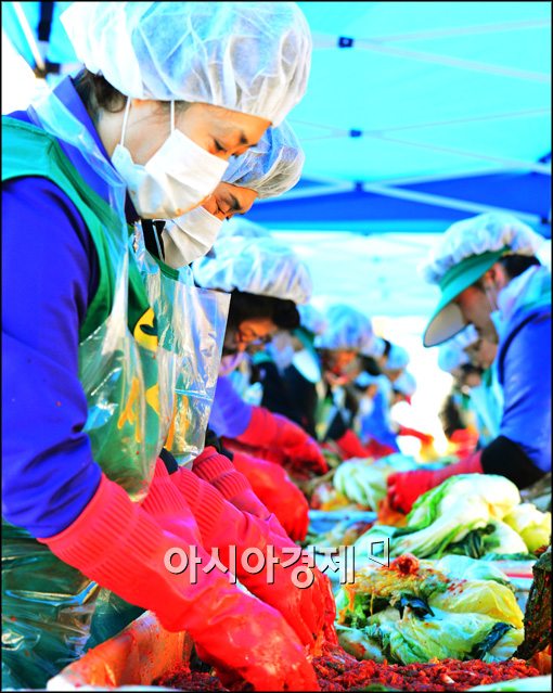 [아시아경제 최우창 기자] 16일 서울시 강남구 일원동 마루공원에서 열린 2012 사랑의 김장담그기 행사가 열린 가운데 참석한 강남구 새마을회 소속 회원들이 김.