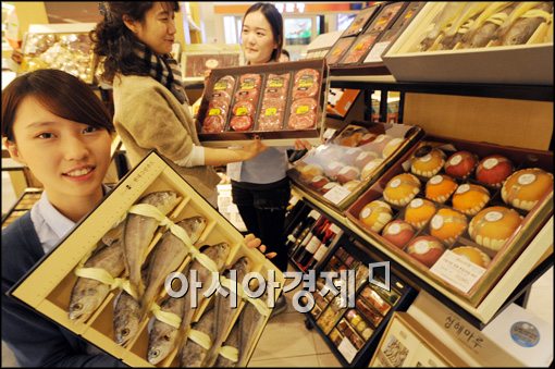 [아시아경제 최우창 기자] 24일 서울 현대백화점 신촌점 설 선물매장에서 모델들이 다양한 선물세트들을 선보이고 있다.
