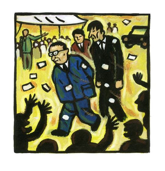 그러자 벤드 소리에 맞추어 미끈한 검은 승용차 뒤에서 이번엔 땅딸막한 오십대 후반의 검정색 뿔태 안경을 쓴 오십대 후반의 양복쟁이가 조폭 두목처럼, 졸개들 두엇을 달고 앞으로 나왔다. 키는 작았지만 덩치는 빵빵하게 바람 넣은 축구공처럼 다부지게 보였는데 올백으로 기름칠 하여 넘긴 머리는 염색을 해서 까맣게 윤이 났다.
