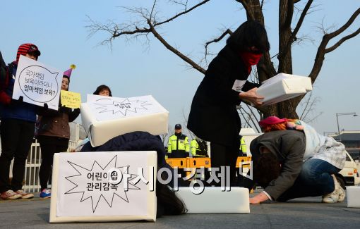 [아시아경제 백소아 기자] 4일 서울 세종로 정부서울청사 앞에서 열린 엄마아빠, 땜질식 보육정책으로 일관하는 정부 규탄 기자회견 및 긴급행동 '땜질식 보육정책, 화가 나서 미치겠다'에서 참가자들이 무책임한 정부에 대한 항의의 몸짓 퍼포먼스를 하고 있다.