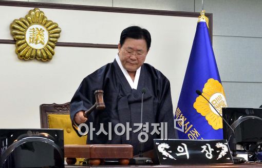 [아시아경제 최우창 기자] 김복동 종로구의회 의장 이 5일 오전 서울 종로구청 내 종로구의회 본회의장에서 열린 2015년 첫 회의에서 개회사를 마친 뒤 의사봉을 두드리고 있다.