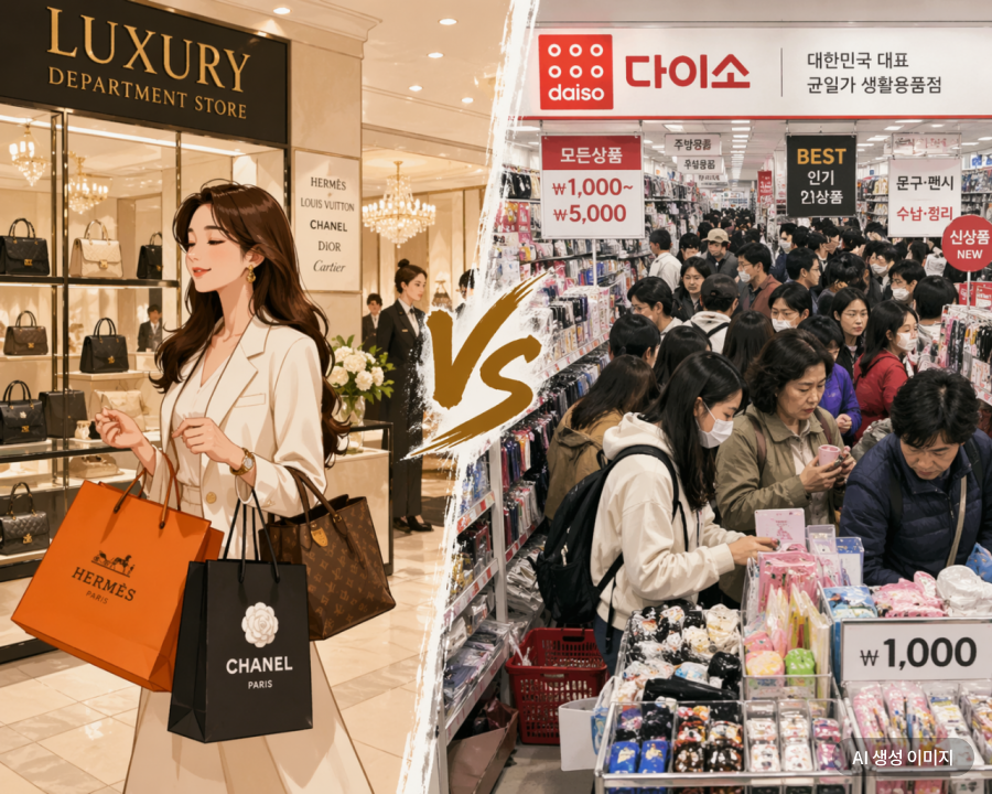 이 같은 극단적 소비 행태는 자본과 노동의 격차가 갈수록 벌어지는 데다 최근 주식시장 급등에 따른 자산 양극화가 더욱 부추기고 있다는 지적이 나온다. 코스피가 사상 최고 수준을 경신하는 등 유동성이 상위 자산으로 집중되면서 수혜 계층은 고가 소비를 확대한 반면, 나머지는 고물가로 인한 생활비 부담으로 지출을 줄이고 있다는 것이다.