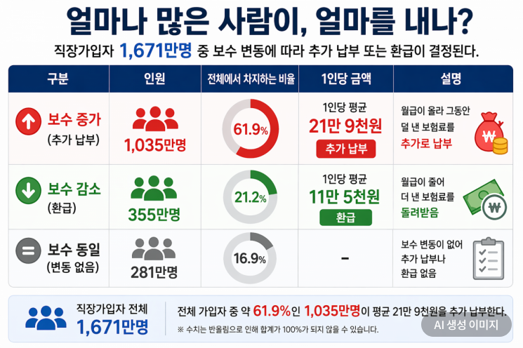보수가 증가한 1035만명은 1인당 평균 21만9000원을 추가 납부합니다.